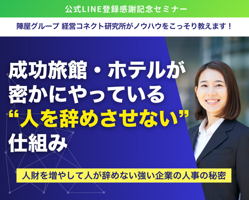 セミナー内容 | 永続経営のためには人財が必須です。しかしながら人財採用と定着に困っている旅館・ホテルの経営者が多いのが現状です。しかし成功旅館・ホテルは実はこっそりやっていることがあるのです。それは採用から人財育成をして良い風土文化を作っているのです。公式LINE登録特典としてそのノウハウを一部公開したいと思います。セミナー時間 1時間10分 【セミナーの学べるポイント】 1.会社の4大経営資源を把握する 2.新世代の転職回数と採用コストを知る 3.チェックリスト 貴社の人財定着率のレベルチェック 4.人財定着率の高い旅館・ホテルの施策事例 5.人財定着率が悪い旅館・ホテルの経営者の行動パターン 6.人財定着率を上げるための面接から育成する具体的手法公開 7.即時効果のある永続経営研究会について 8.経営コネクト研究所ご利用のお客様の声 宮崎県高千穂 神隠れ様 |